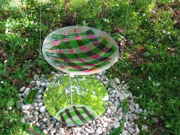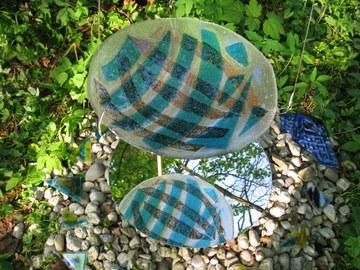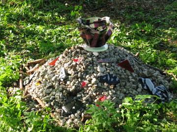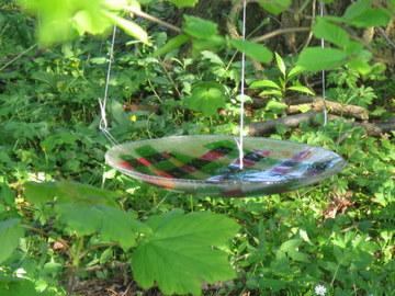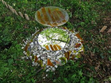 Shinto Installatie van drie hangende schalen en een vaas op een "heilige'plek in het bos Als u klikt op "grotere afbeelding"worden er zes foto's van afzonderlijke onderdelen zichtbaar.